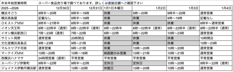 2025年から2026年の年末年始営業時間横浜西区スーパーマーケット営業時間まとめました