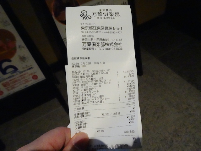 参考価格として:万葉倶楽部での会計、日曜日大人2名幼児1名食事1回10560円でした(万葉クラブ会員で入館料50%オフを大人が使用)